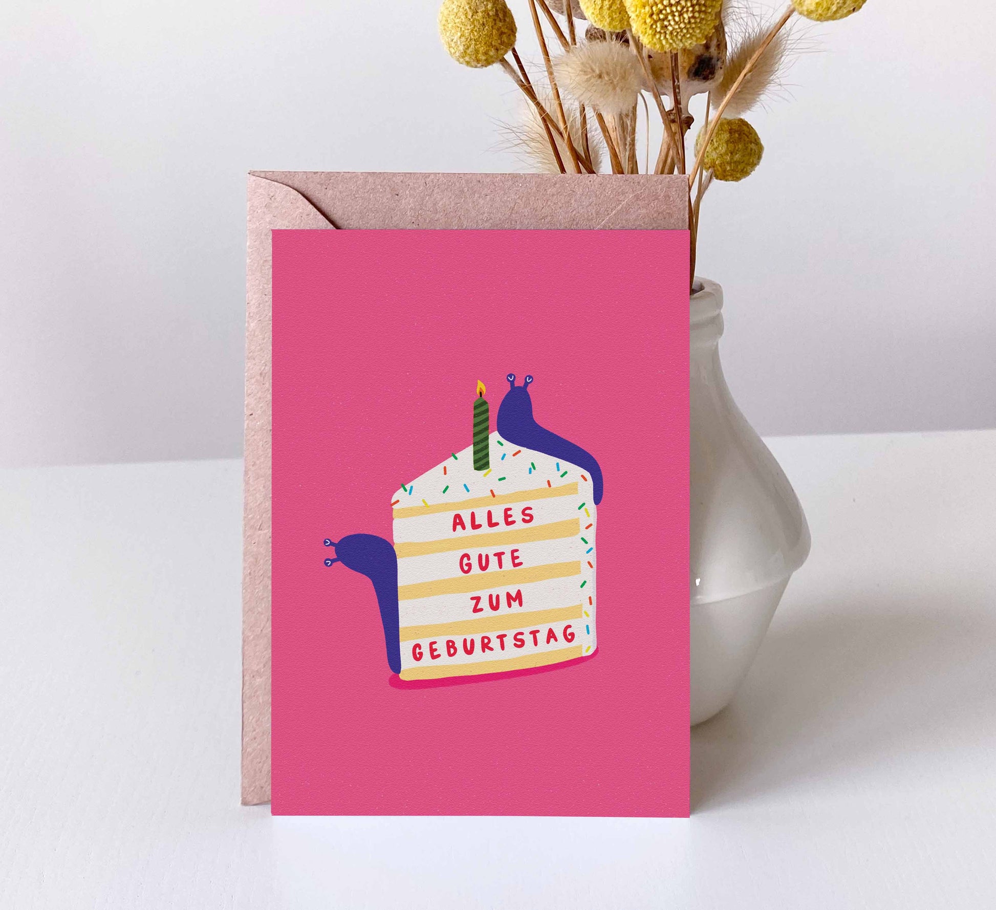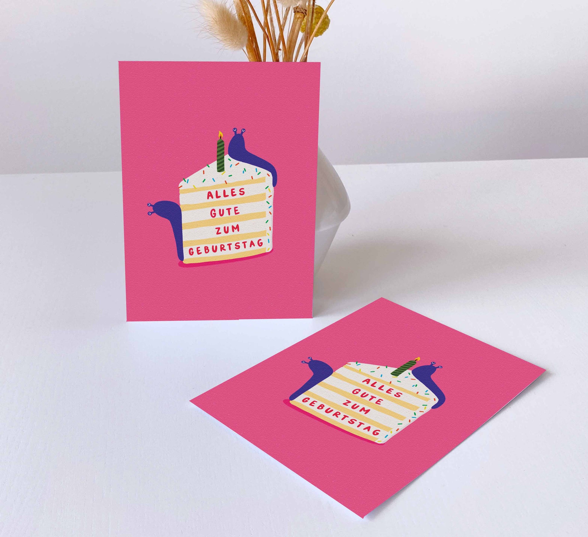 Birthday card featuring a piece of cake and two friendly slugs! This design was originally made to celebreate Sentient Stories' first birthday, and now it's available to you. A bright and cheerful birthday greeting, with a bit of a snaily twist.
