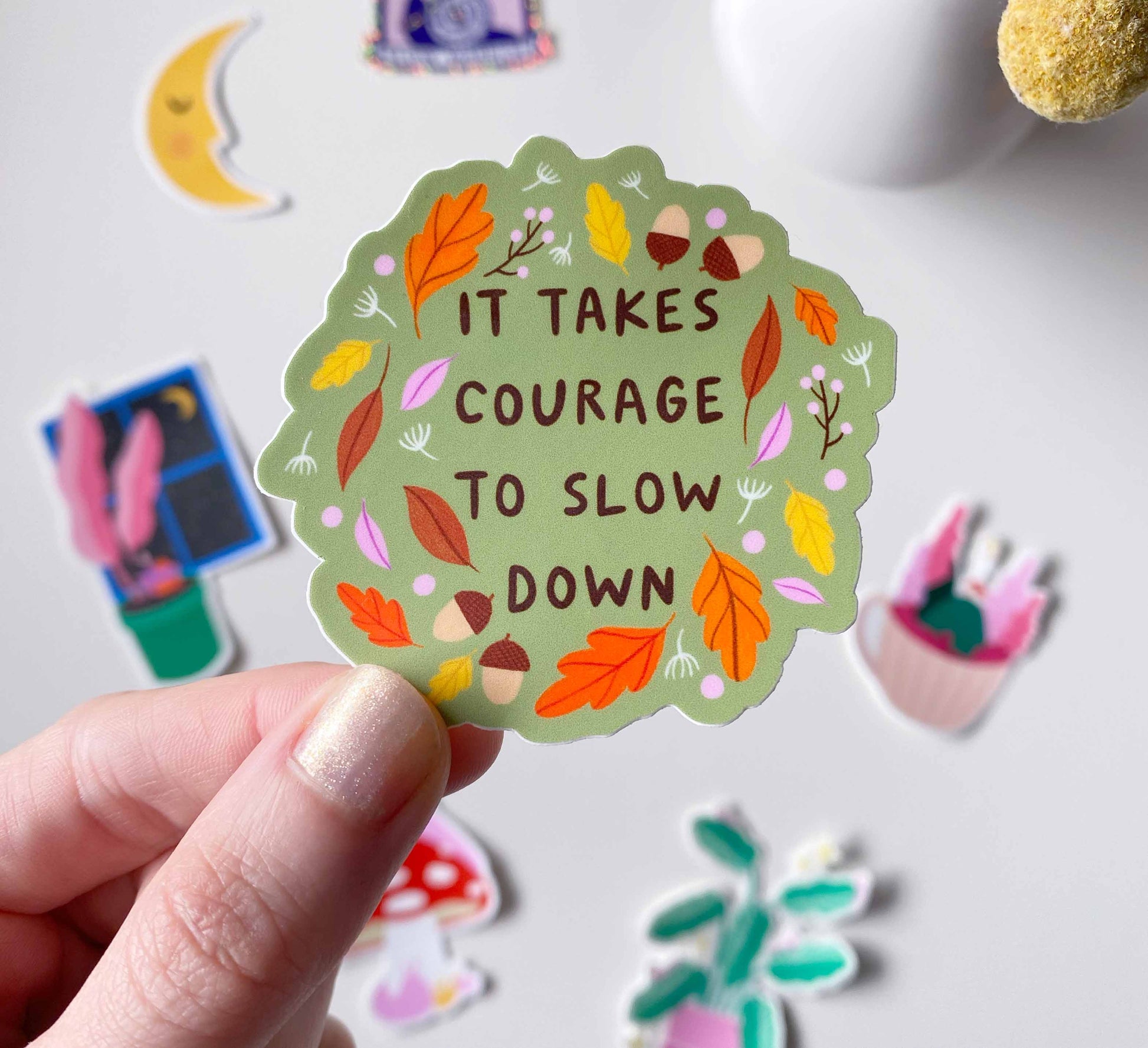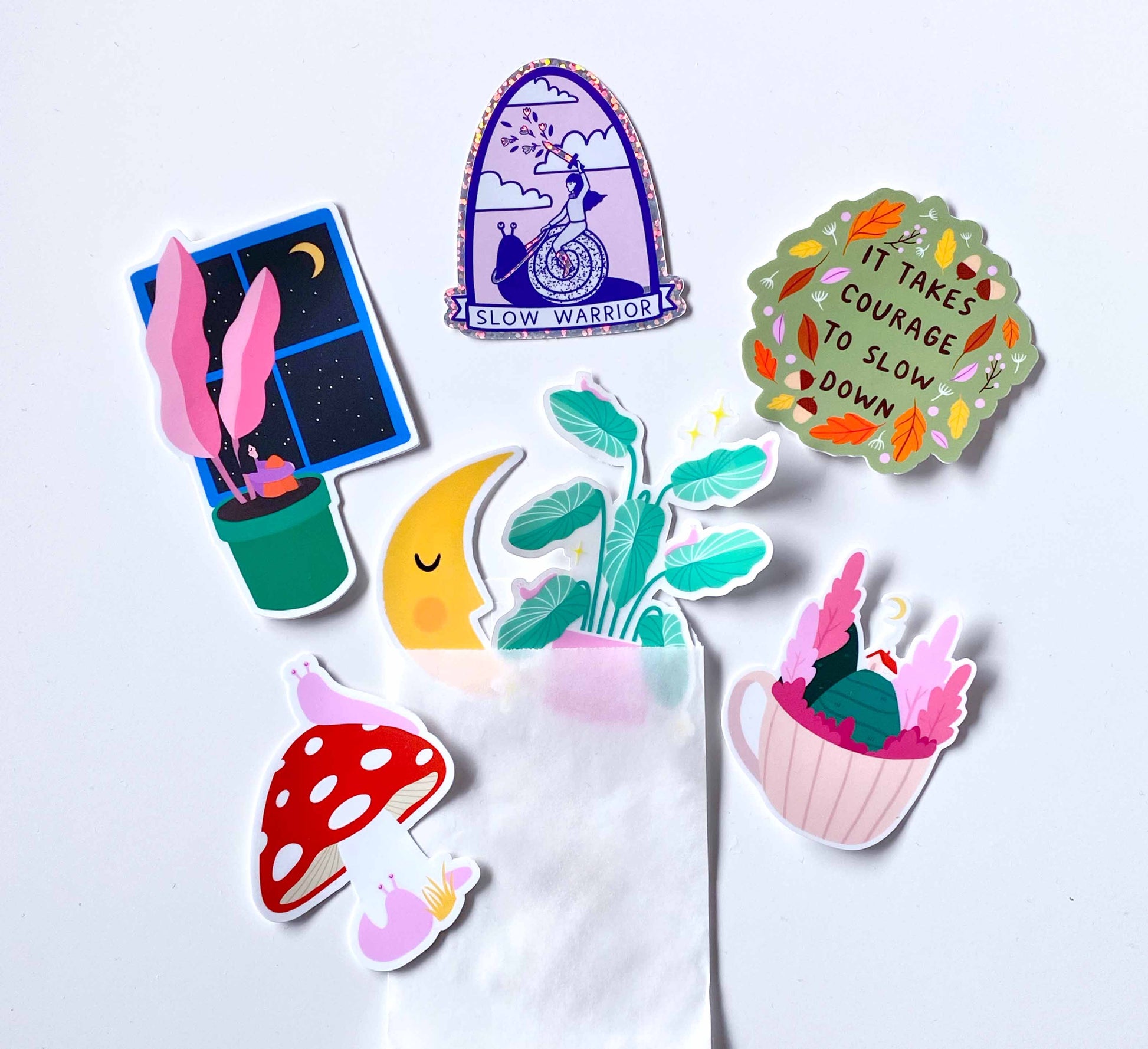 - Stickers: 'It Takes Courage', 'Slug Party', 'Slow Warrior', 'Forest Friends', 'Teacup Retreat', 'Golden Moon' and 'Moon Gazing'