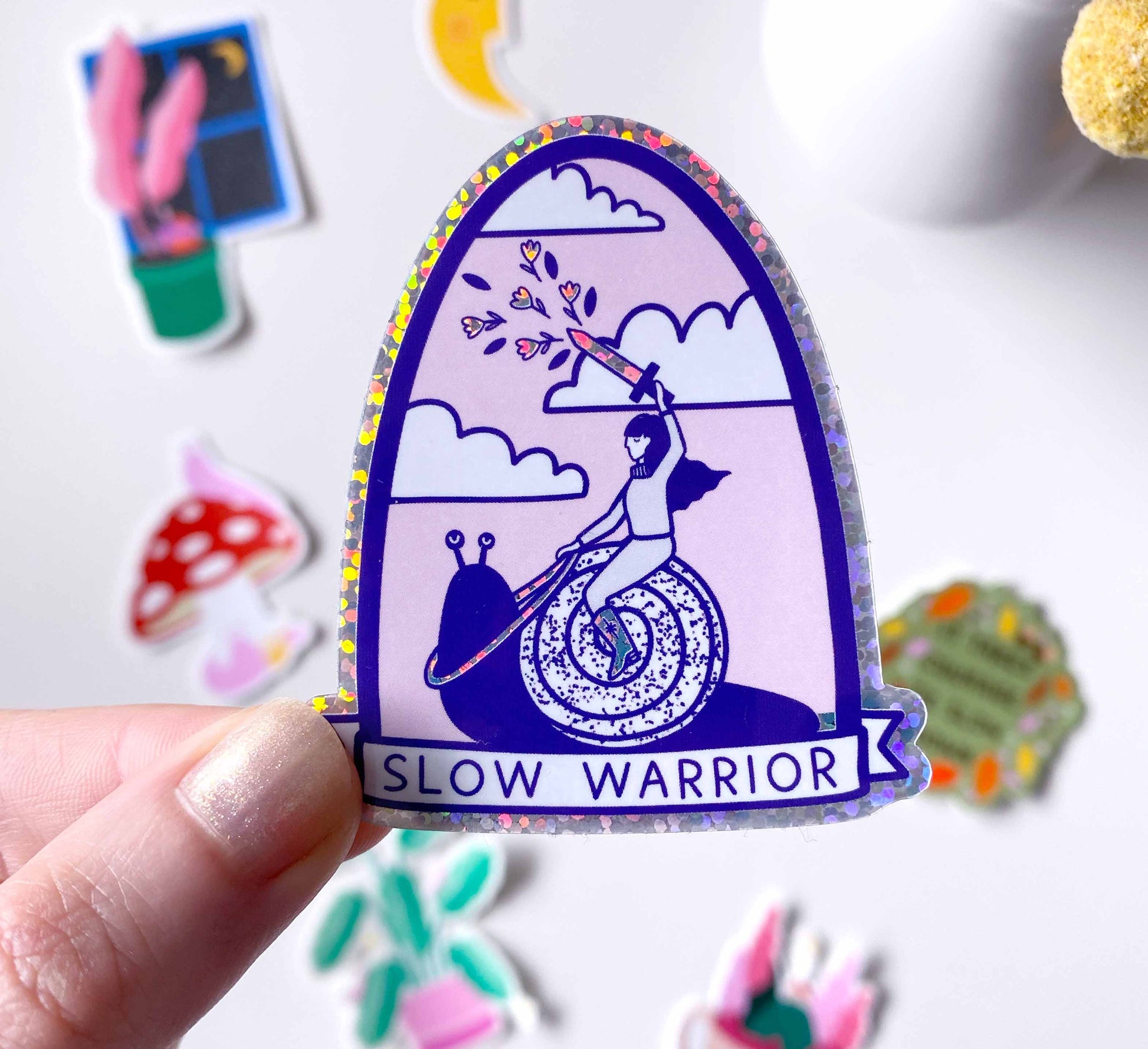 Set of 7 dreamy vinyl stickers all about slowing down and embracing nature! Featuring colourful slugs, stars, moons, toadstools, teacups and houseplants - all the good things in life. Including matte, transparent and glitter stickers. Perfect for decorating laptops or notebooks.